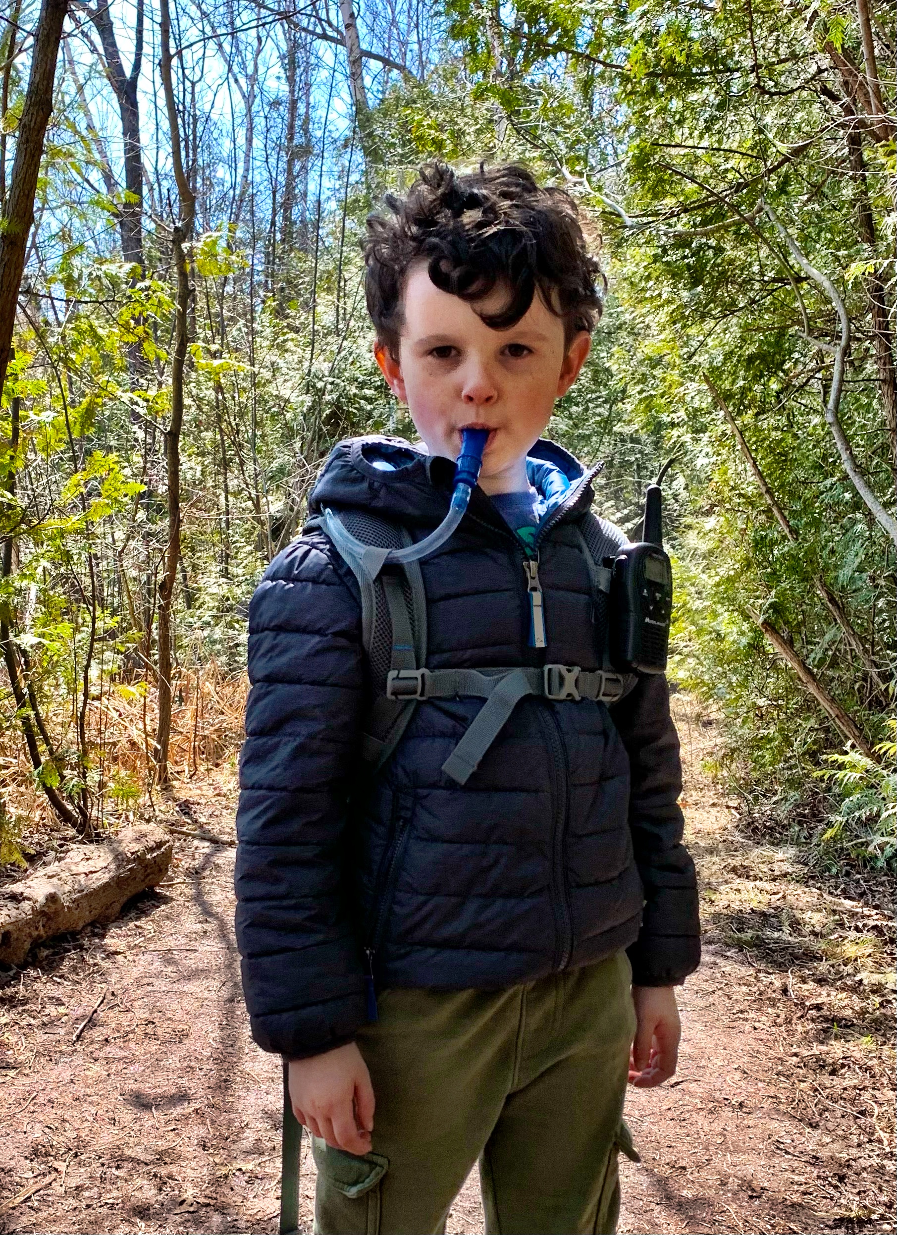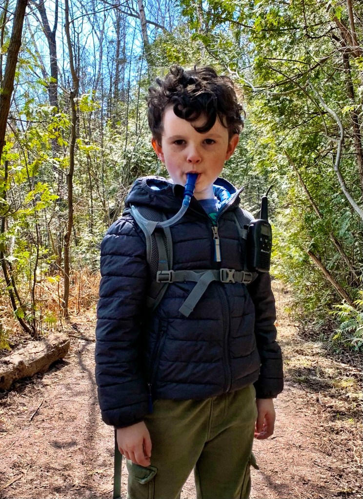 Get them their own hydration pack. A hydration pack is a small backpack that has a water bladder/bag inside with a hose/straw that clips to the backpack strap, making the water accessible all the time without ever having to take the bag off. The main reason I recommend this is because kids love cool gear and love to play the part. Hydration packs usually have a couple of small pockets as well, so I also add a snack (always bring snacks). My youngest son really likes to feel like an outdoorsman so he has a whistle, some bandages and wipes in there too. The bigger plus of a hydration pack though? You don’t have to carry their stuff! Lighten your load! You can find hydration packs at most outdoor and sports stores (runners and cyclists use them too so they’re everywhere). For this post I ran into Walmart to check the prices and they had them for $20. It’s honestly one of the best pieces of kid gear we own and I highly recommend it for your kids.